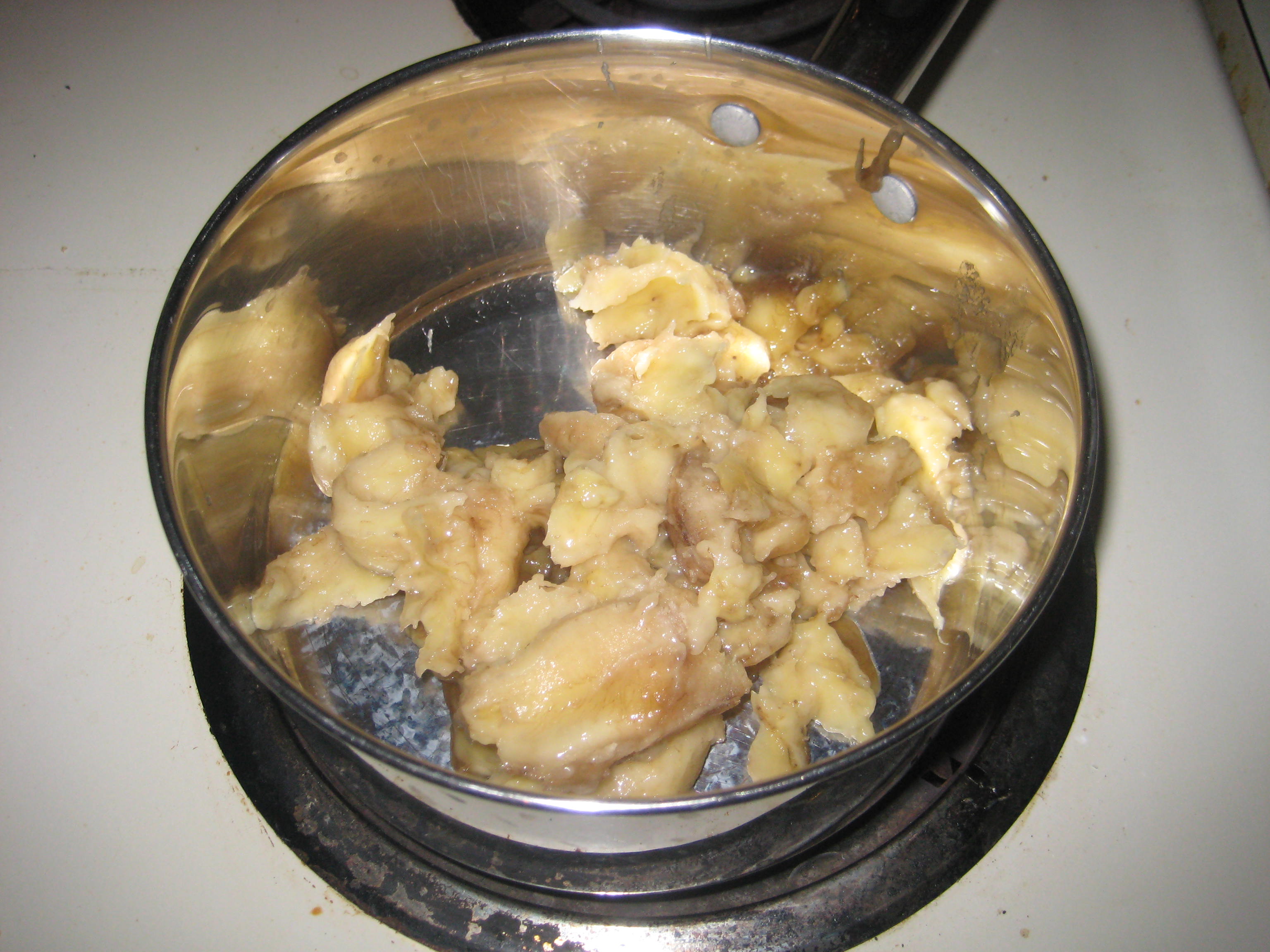 The first step was to make the jam, or banana filling.  Since I only had three bananas, I halved the original recipe and mushed them into a saucepan.  Then I added the sugar, water, vanilla (I used liquid vanilla extract rather than a vanilla bean because that’s what I had on hand) and lemon juice, then turned the heat to high.