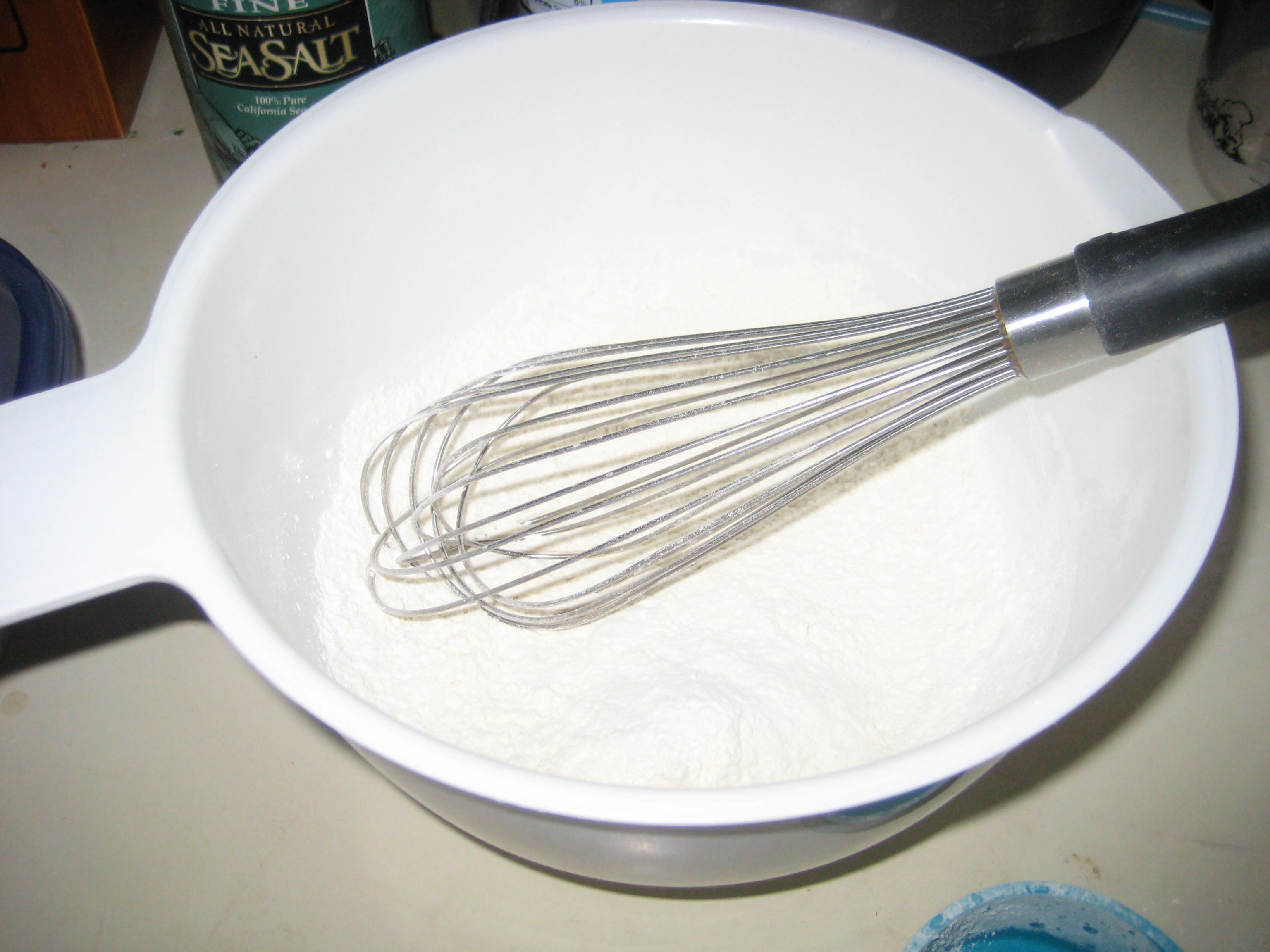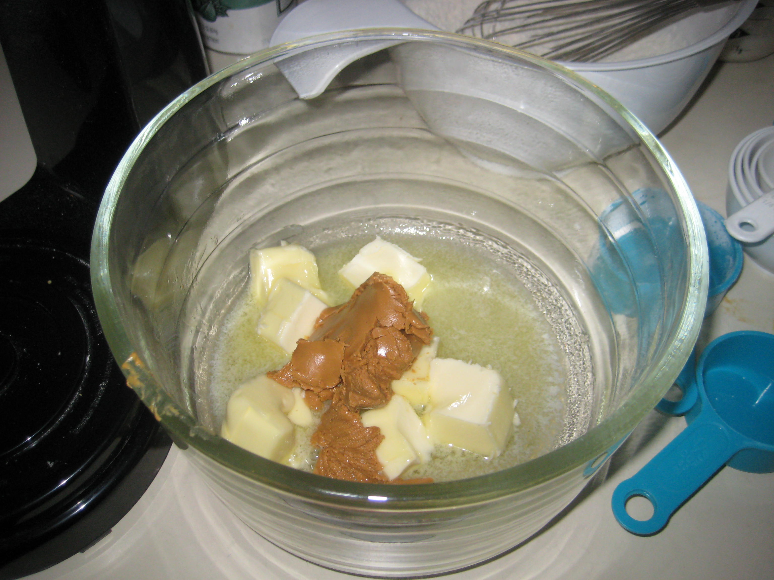 Once the flour was mixed well with the baking soda and salt, I stuck the butter and peanut butter in the microwave to soften.  While that was in the microwave, I made my own buttermilk by adding 1 tbsp. of vinegar to 1/2 cup whole milk and let it sit to thicken.