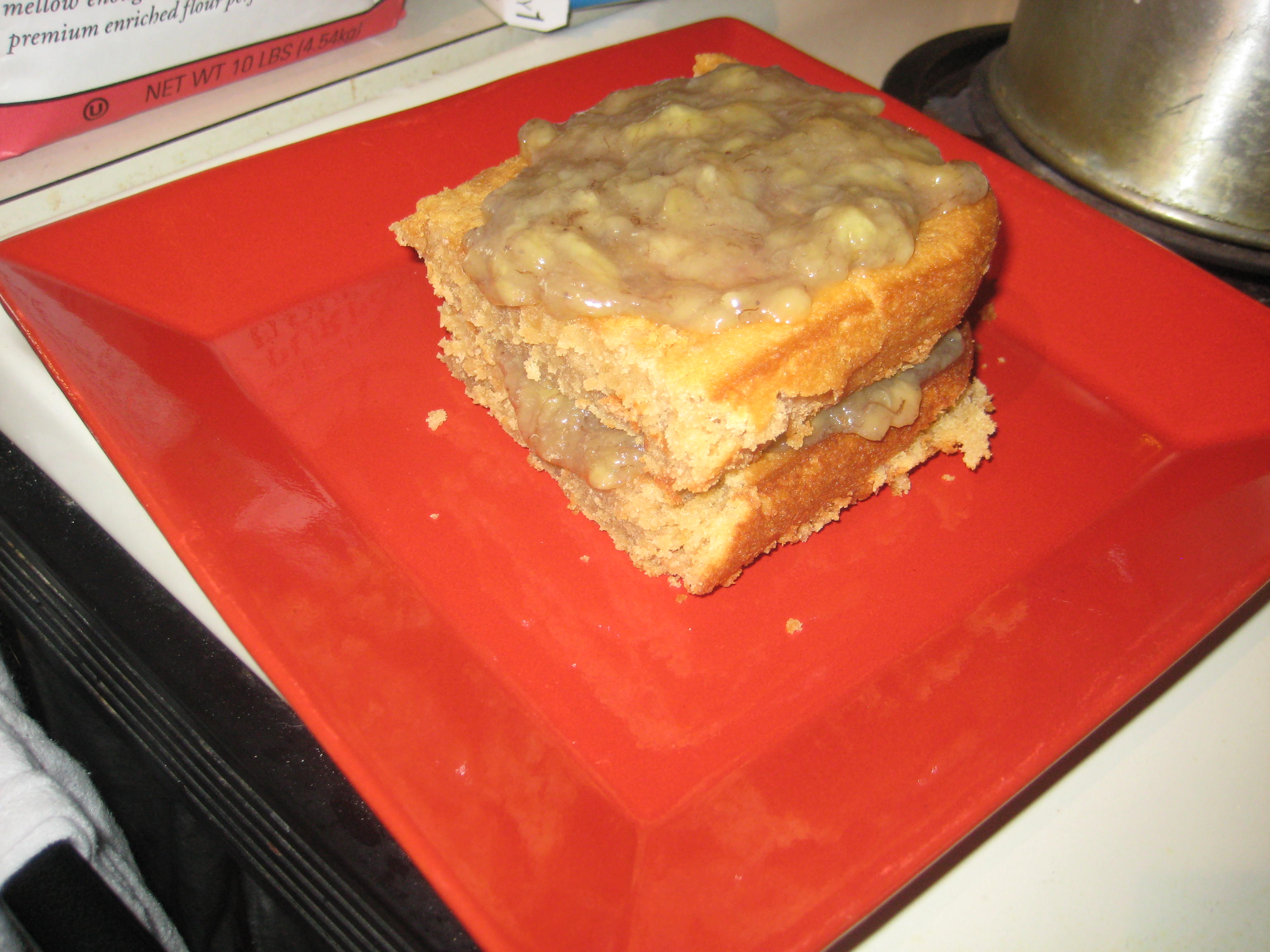 When the cake came out, I checked it for doneness (it stayed really moist but was totally done) and let it cool for a bit.  I slid a knife around the edges, then put a paper towel over my hand and flipped it out onto my hand, then set it down on a flat baking sheet.  I cut the cake into four equal-sized square pieces, then assembled the cakes (more like mini cakes) by placing one square piece on the bottom, covering it with a good amount of the chilled banana jam, then another cake piece on top.  I topped it with some more of the banana jam, then let it sit and did the other mini cake.