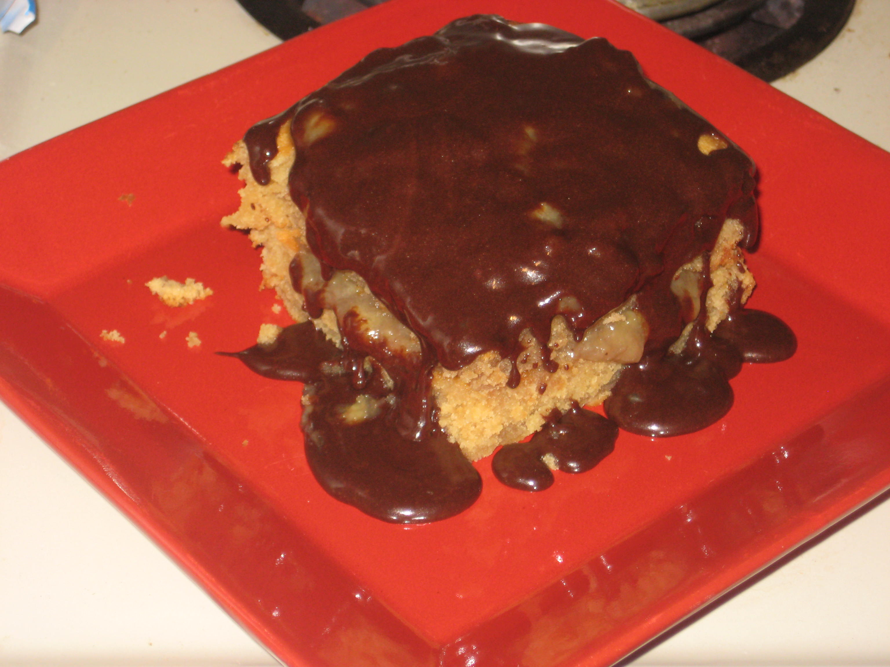 I had some chocolate frosting in the fridge that was leftover from another dessert, so rather than make the white frosting the recipe called for (and because I’m a chocoholic), I stuck the frosting in the microwave until it was thin and smooth, then dumped it over the top of each cake, spreading it and allowing it to drizzle down the sides.