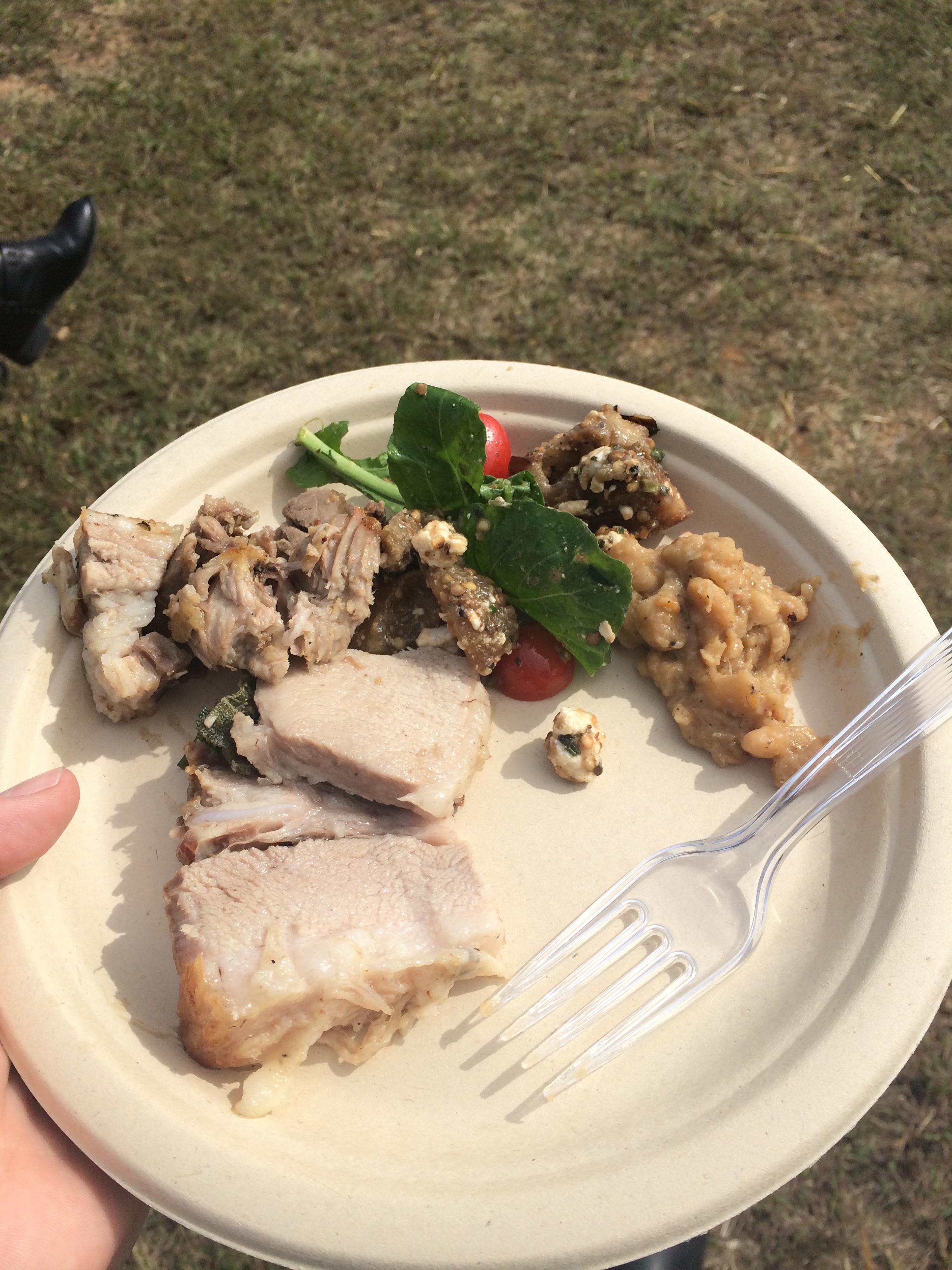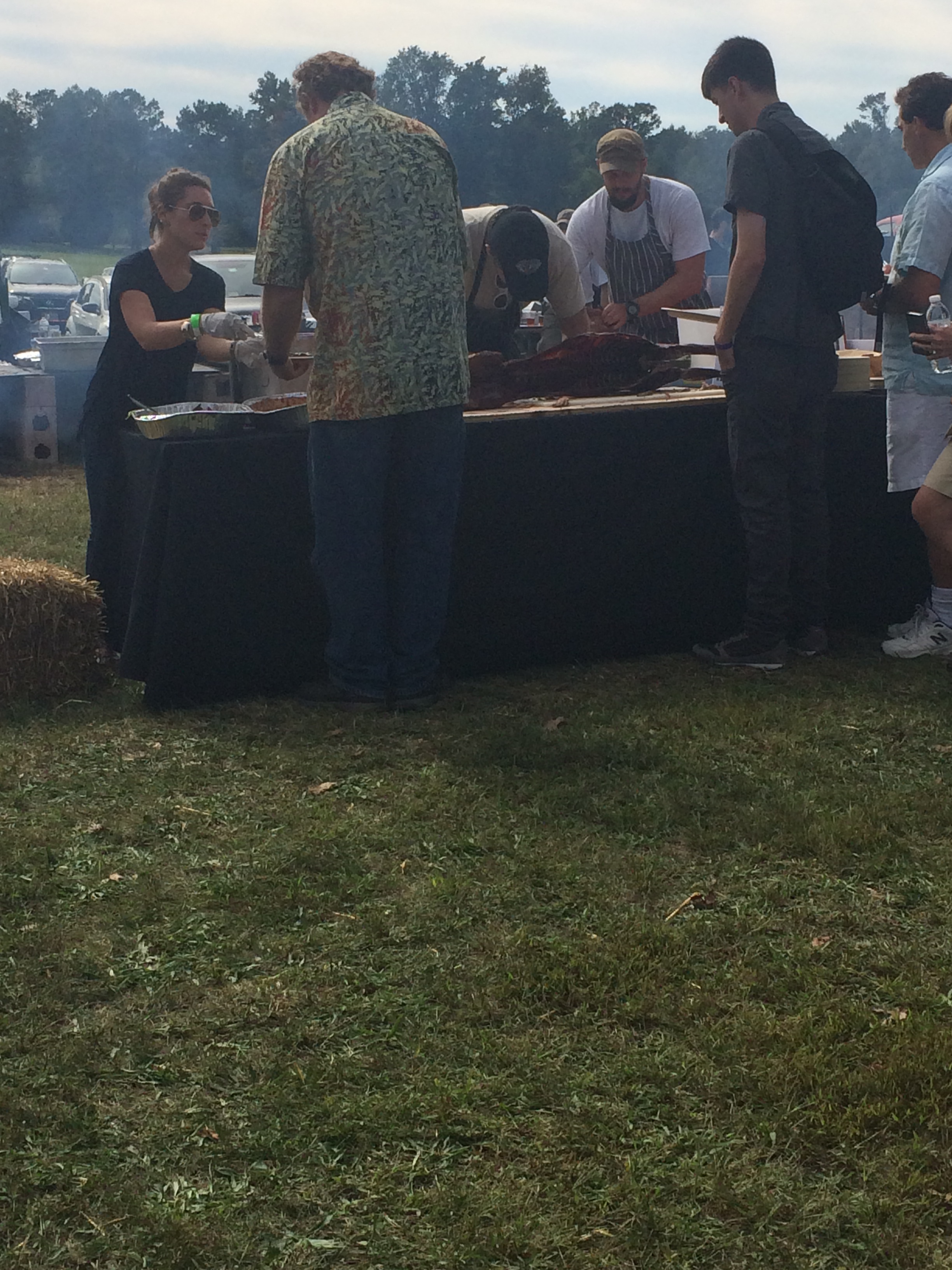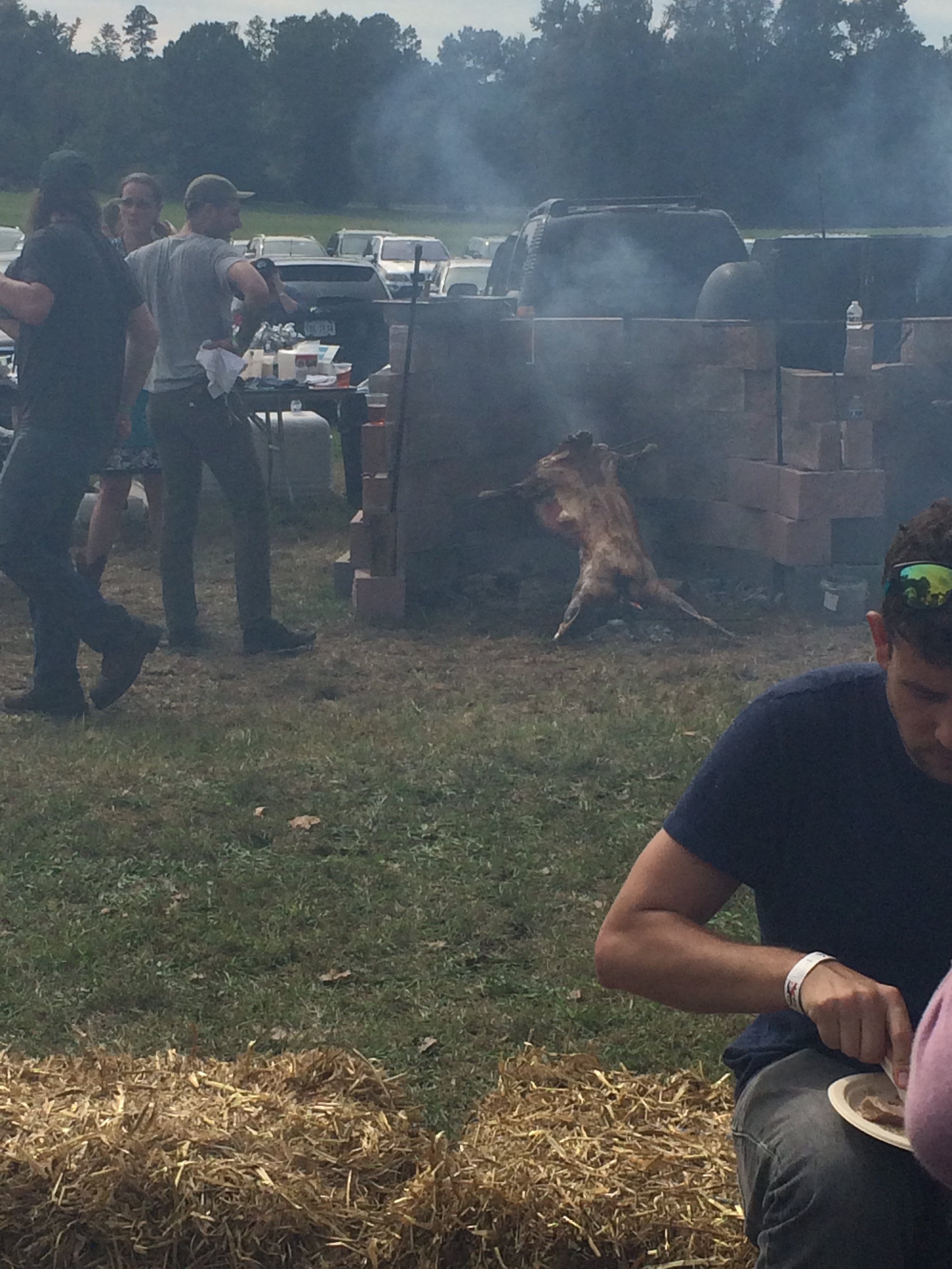 The slow-cooked meats were all delicious. Long, slow cooking over open fires is a technique that goes way back, probably into prehistory, and there’s something primal (and yummy) about seeing and smelling the different animals being cooked. The outside skin crisps up or chars, and the meat inside is left to roast in its own fat. The duck, especially, was amazingly juicy. The sides were veggie-heavy and plentiful. The ambience – hay bales for seating and constant cornhole games – was laid back but what I like to call “country elegant” (think Garden and Gun magazine). Lots of girls in dresses and cowboy boots.