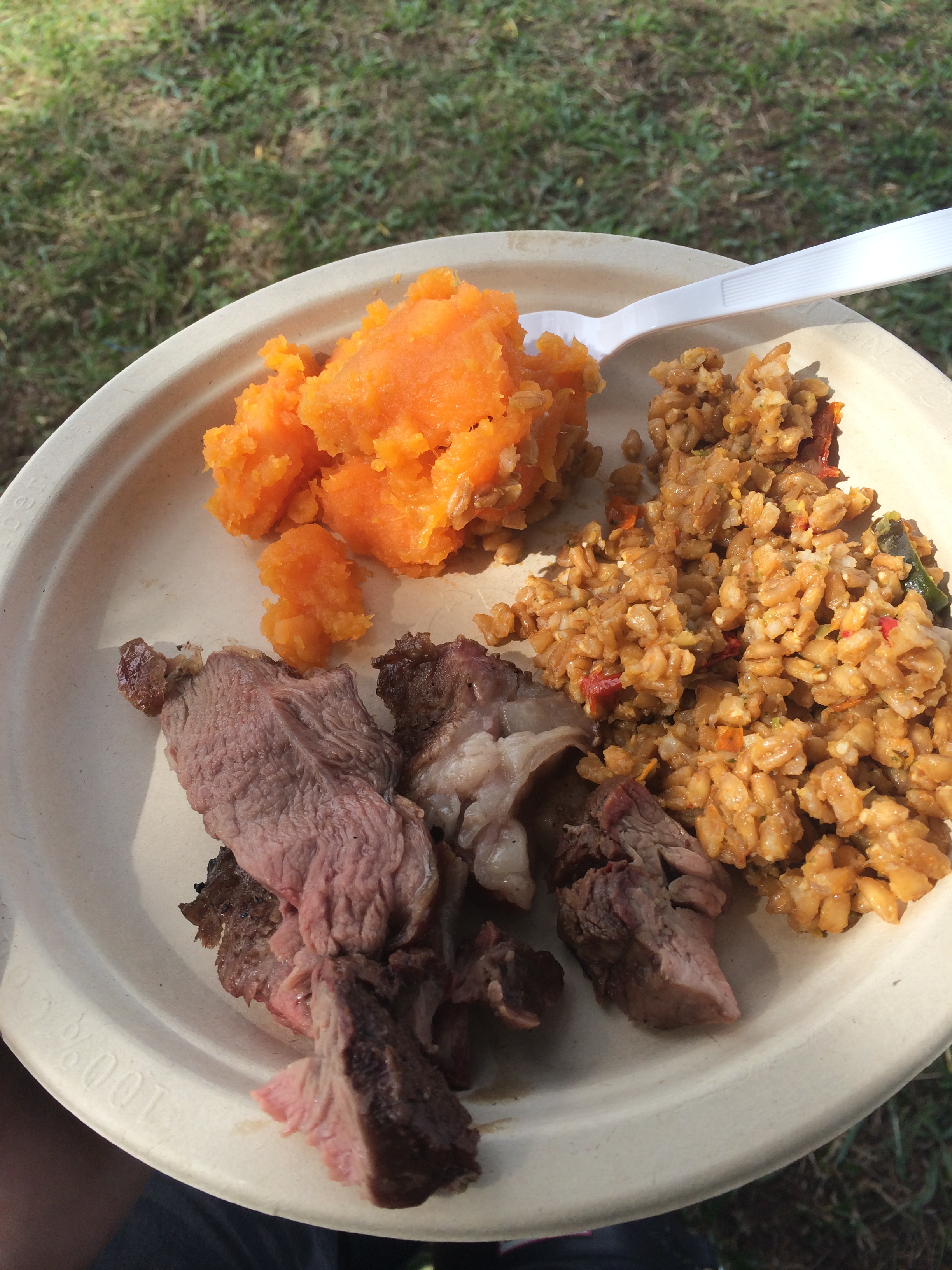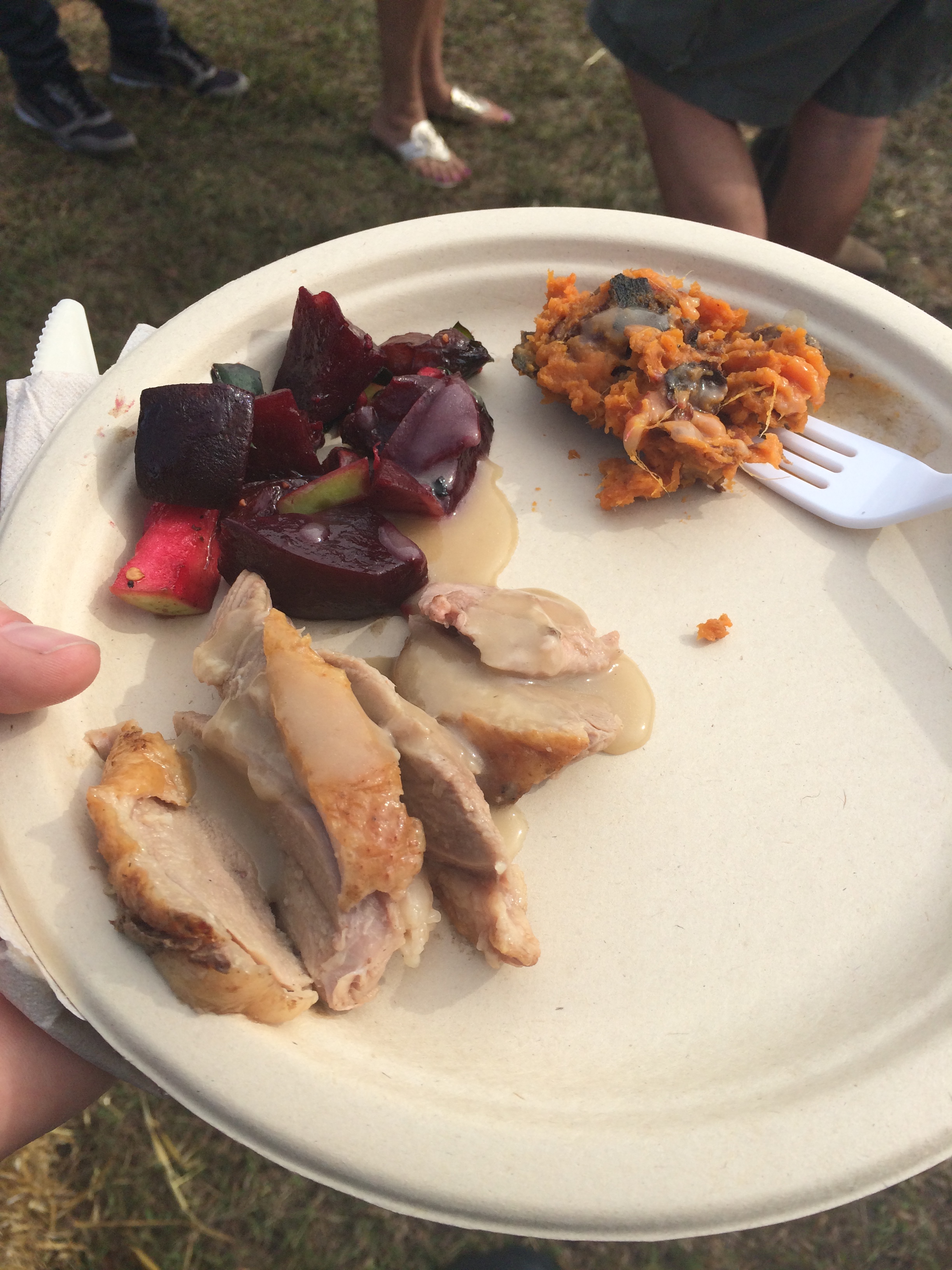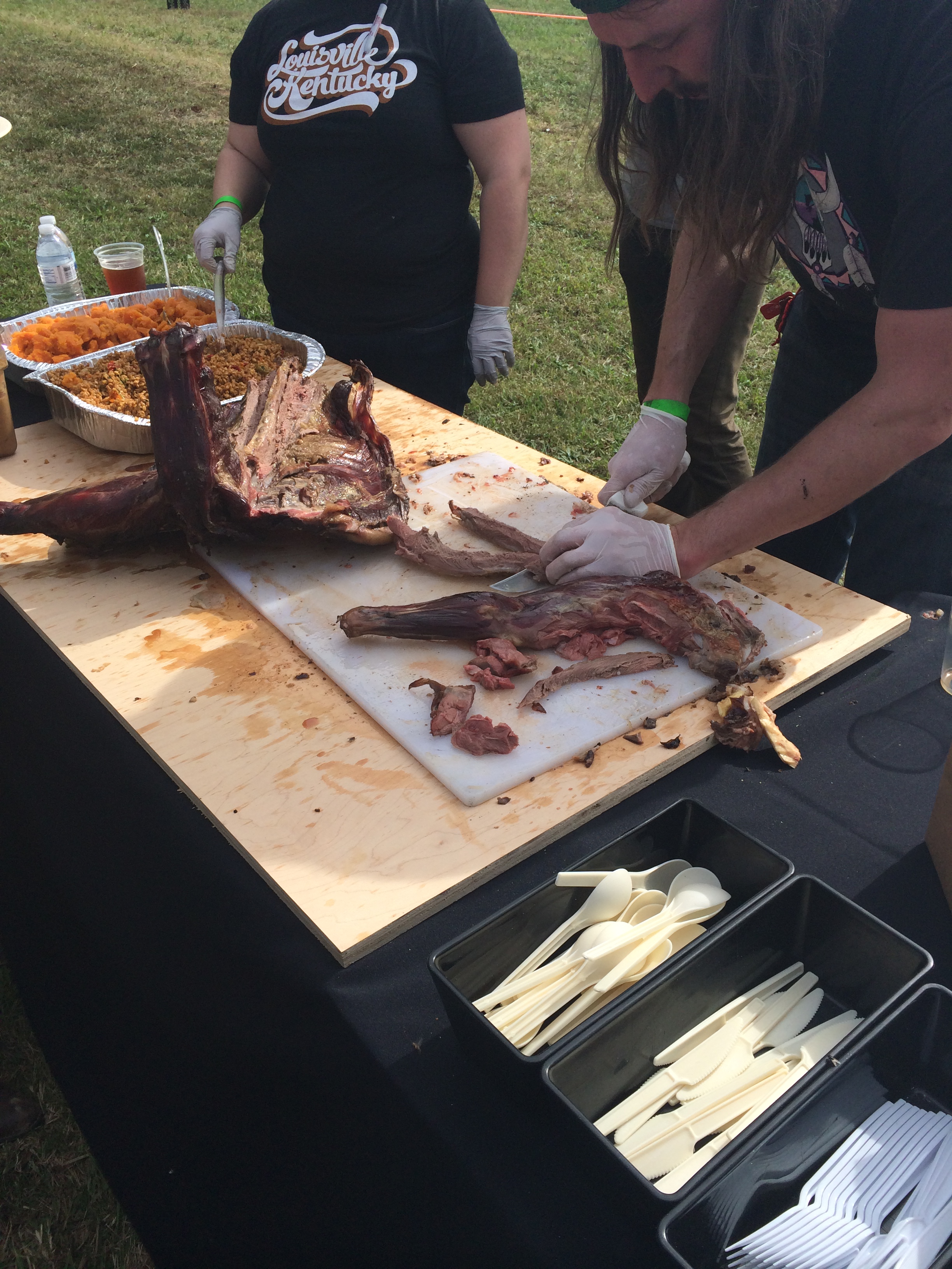 The slow-cooked meats were all delicious. Long, slow cooking over open fires is a technique that goes way back, probably into prehistory, and there’s something primal (and yummy) about seeing and smelling the different animals being cooked. The outside skin crisps up or chars, and the meat inside is left to roast in its own fat. The duck, especially, was amazingly juicy. The sides were veggie-heavy and plentiful. The ambience – hay bales for seating and constant cornhole games – was laid back but what I like to call “country elegant” (think Garden and Gun magazine). Lots of girls in dresses and cowboy boots.