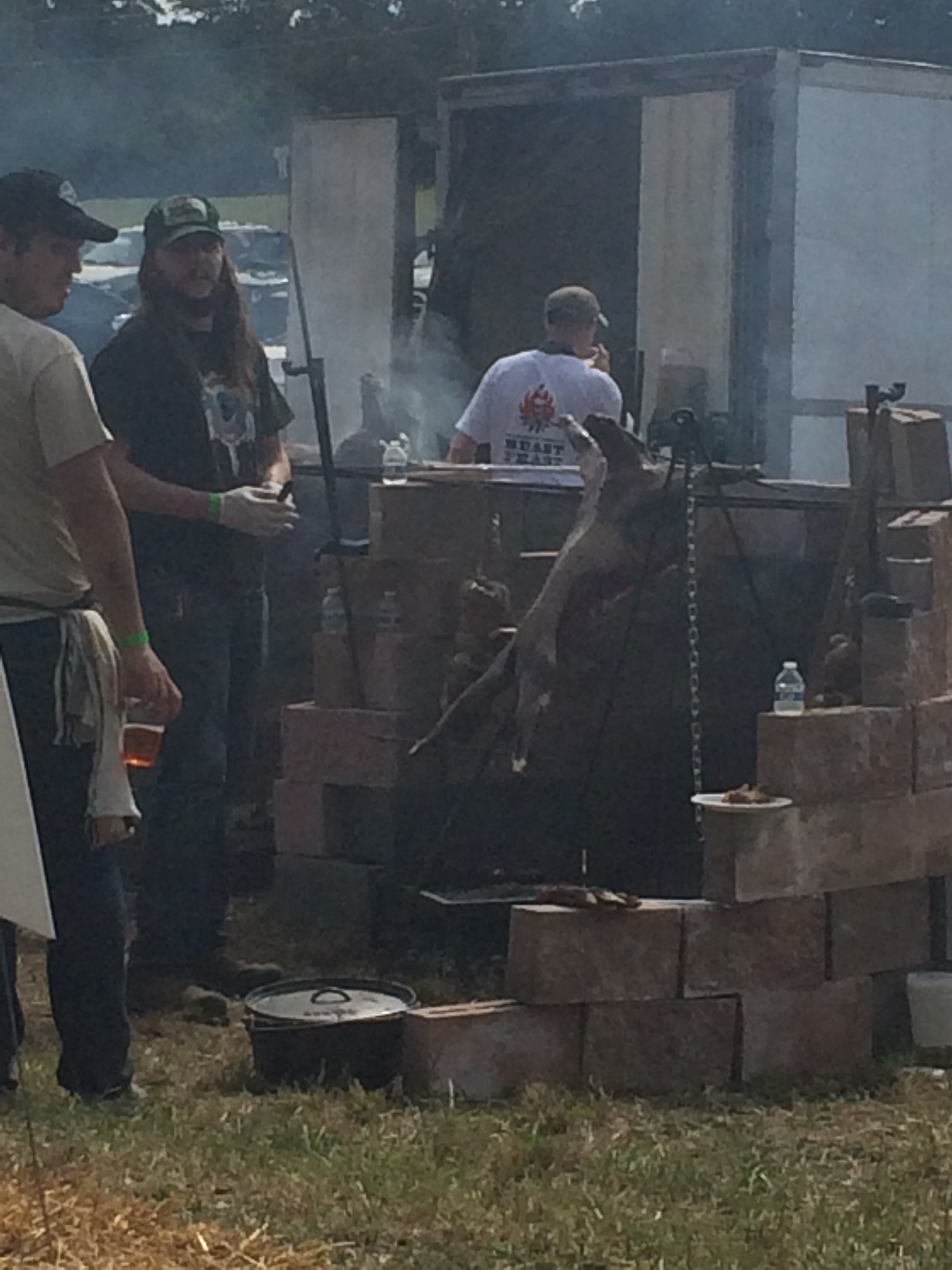 Beast Feast 2014 was held on the lawn of Patrick Henry’s Scotchtown and featured local chefs and butchers slaving over open fires since the wee hours of the morning to cook whole goats, pigs, ducks, chickens and sides of beef. They fixed some delicious side dishes too. There was also lots of local beer, wine and cider to sample. Oh and a country/bluegrass band. And a chance to tour Scotchtown. And if you paid a bit more for a VIP wristband, plenty of cocktails mixed and served by local bartenders and Rappahannock oysters to enjoy.