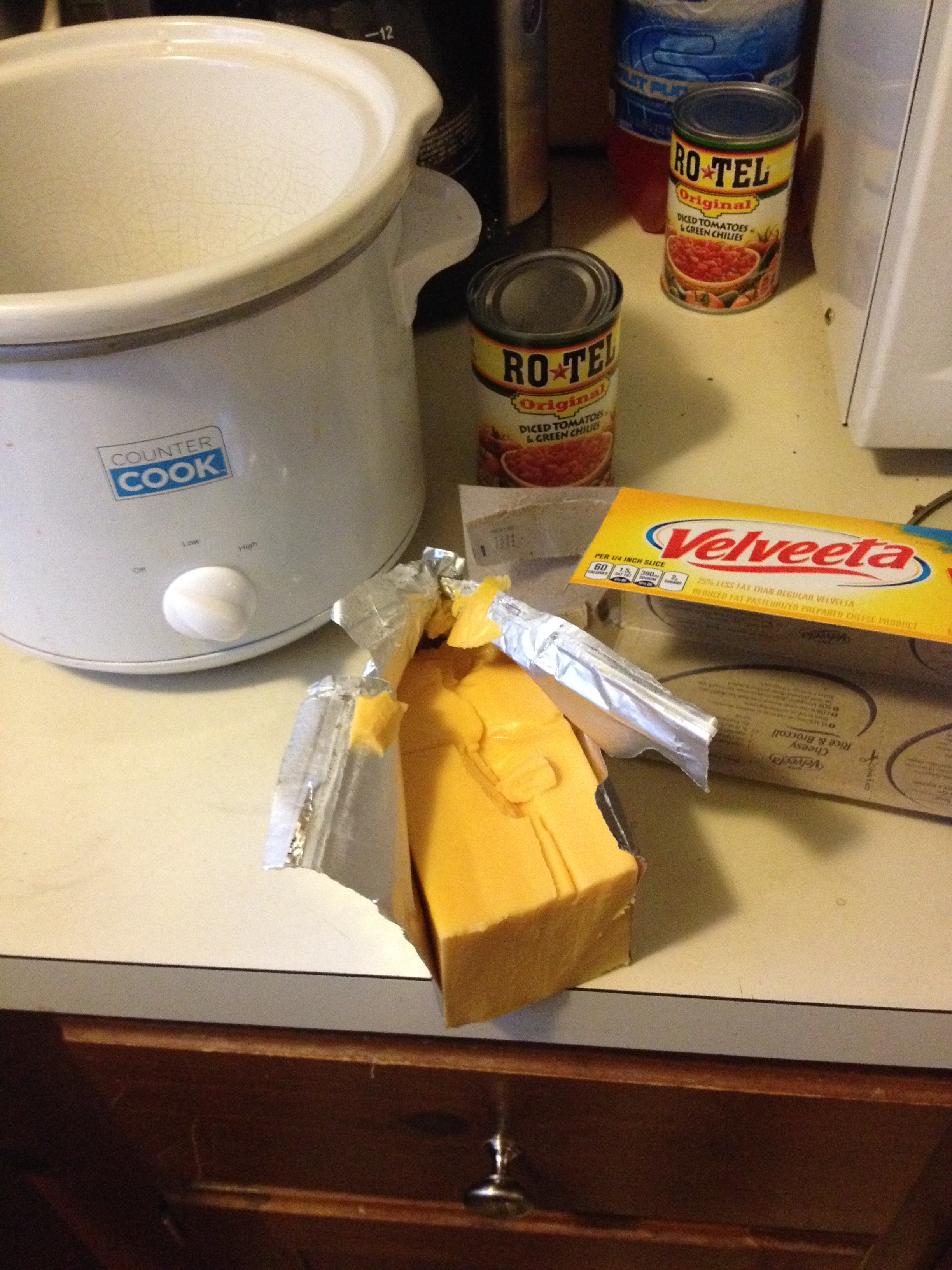 I also made a truckload of Mexican food for the Super Bowl, starting with an old favorite: Velveeta and Rotel in the crockpot.
