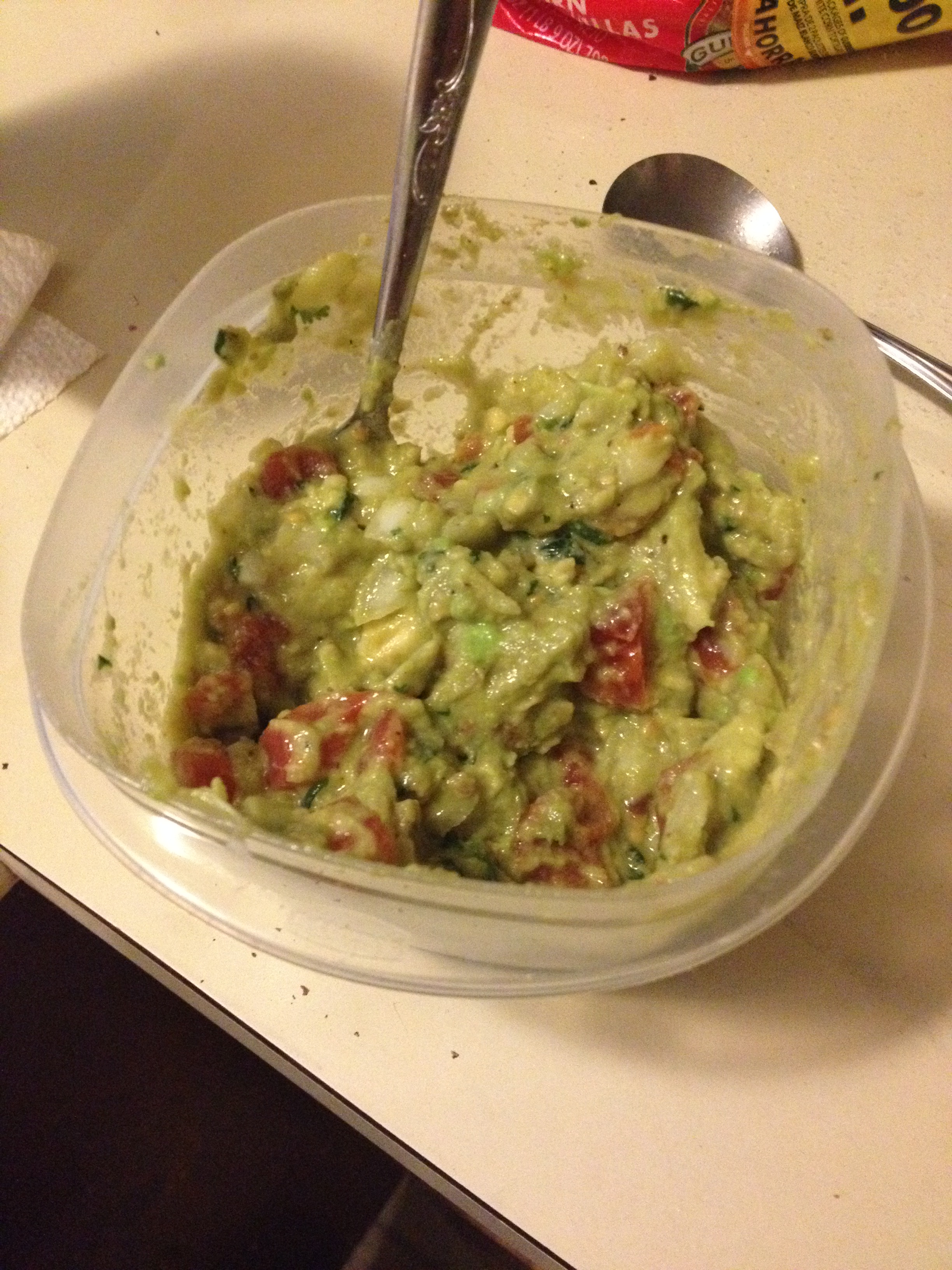 Then I made some guacamole from a recipe on the Rotel can – essentially the same guac recipe I normally make, but substituting the tomatoes and jalapenos for the Rotel.