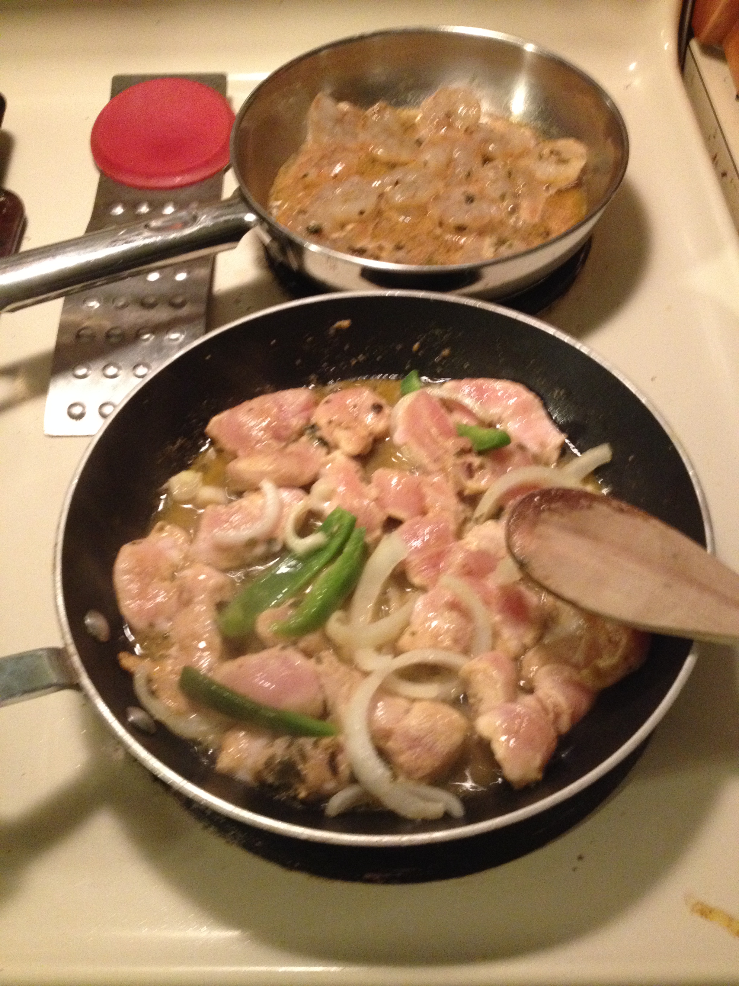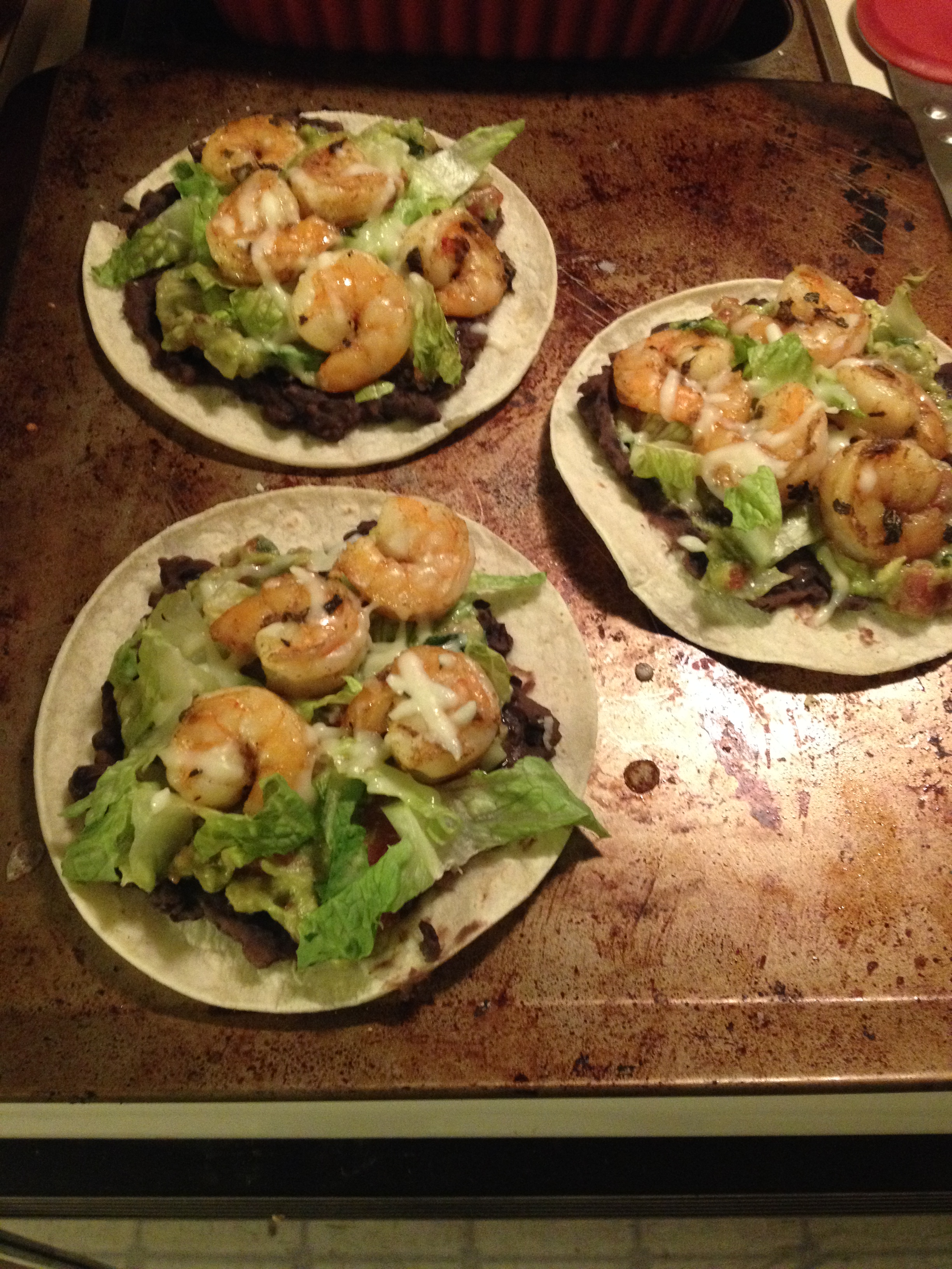 Next, I marinated shrimp and chicken in a baja-style tequila lime marinade with cumin, chile powder and oregano, then sauteed the shrimp by themselves and the chicken with green peppers and onions fajita-style. I made shrimp tostadas with refried black beans, guacamole, lettuce and the shrimp, and had all the fixin’s for chicken fajita tacos.