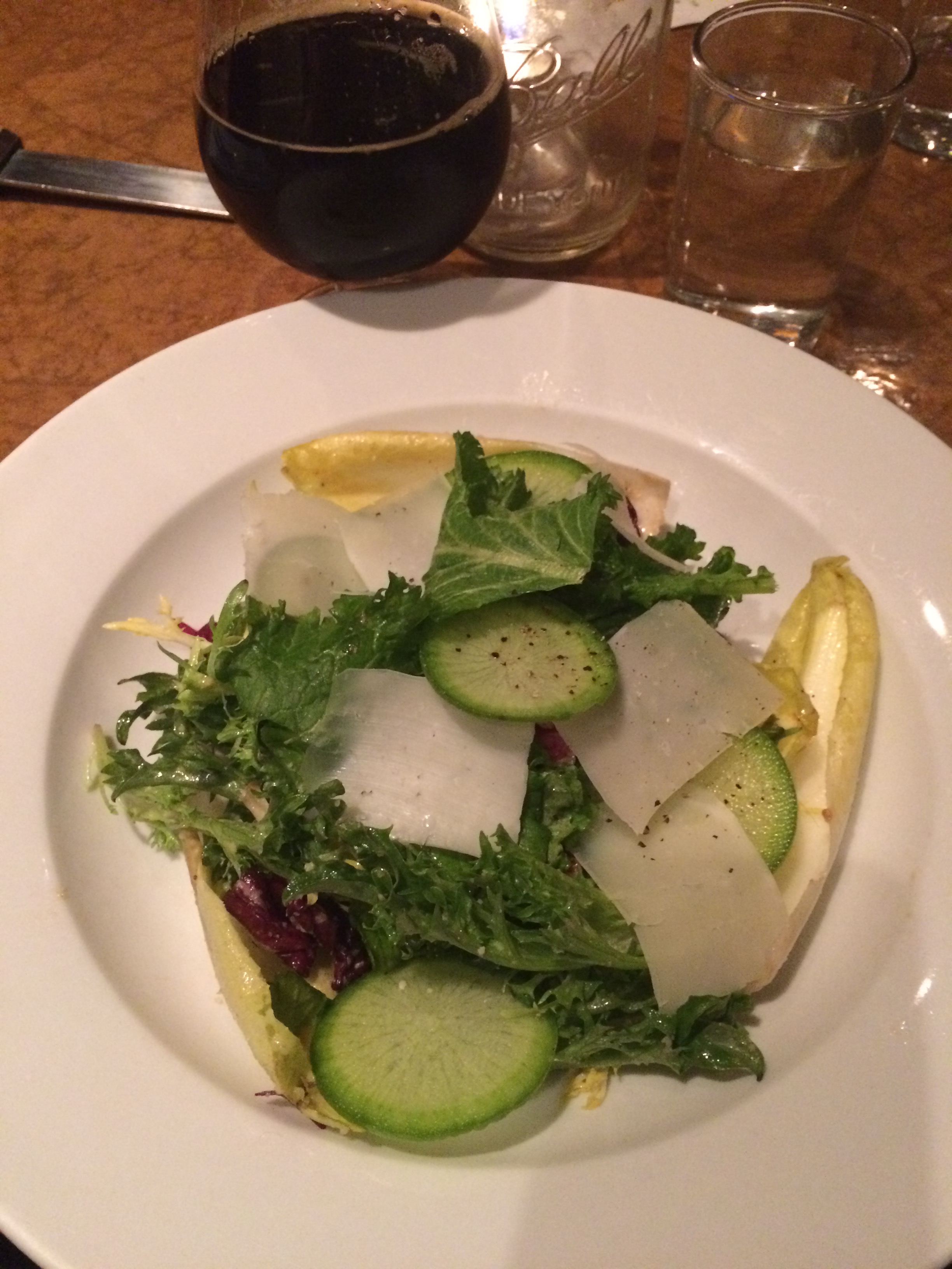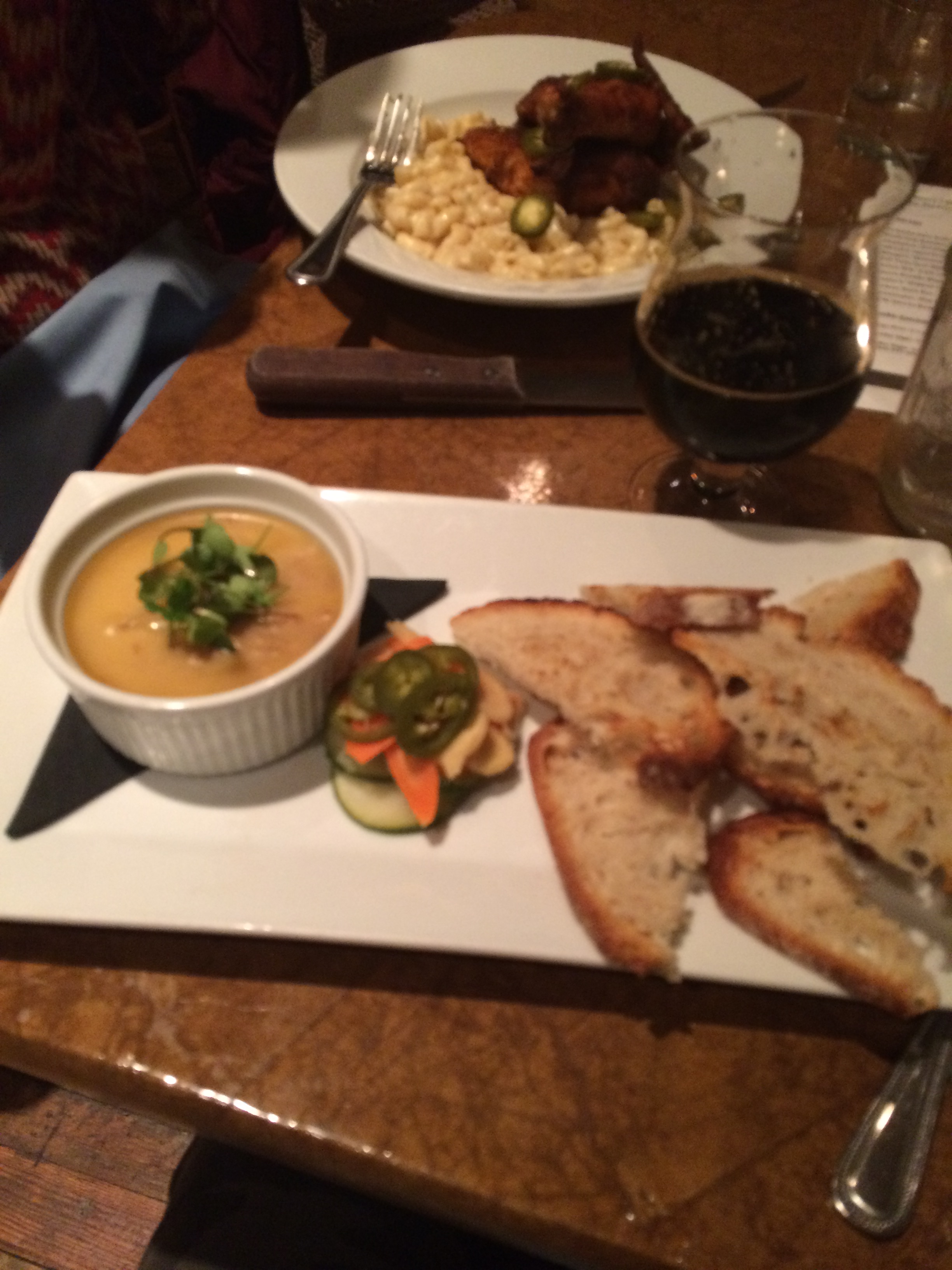 To eat, I chose a chicory salad with manchego, red onions, radish, croutons and anchovy dressing, and the carnitas rillettes, served with toasted billy bread, which were both delicious. After I finished my cocktail, I also got to try an Ardent Dark Rye imperial stout.