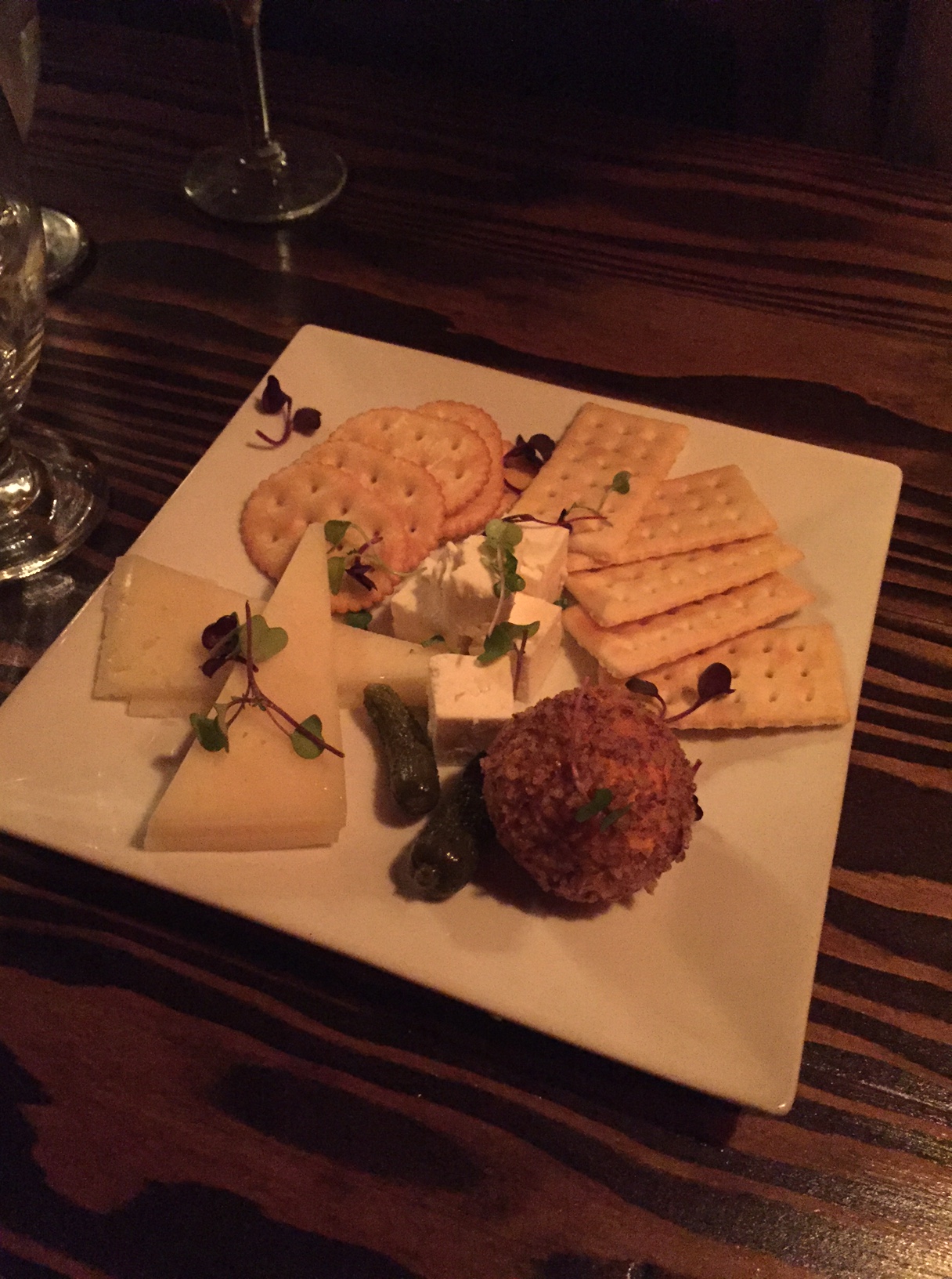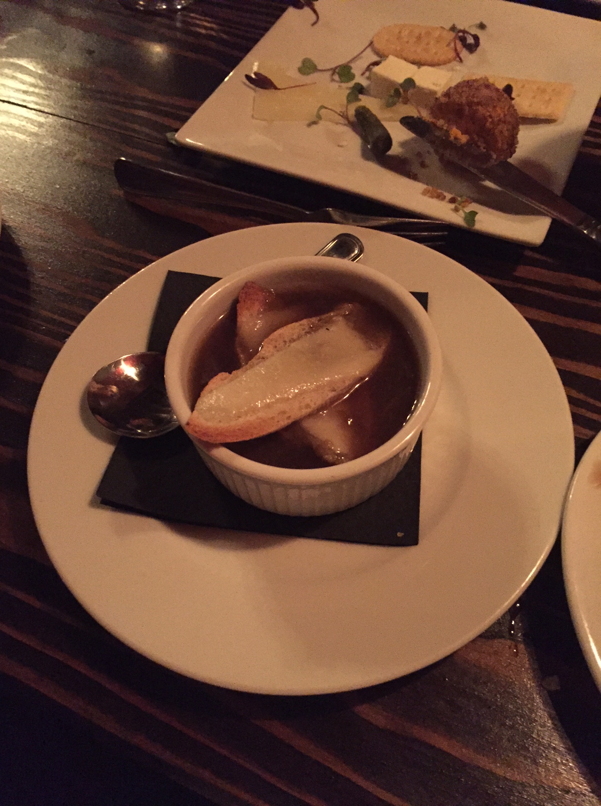 The food was elegant and tasty. I had a cheese and crackers plate and French onion soup. Our group shared some veggies and hummus and parmesan and herb popcorn.