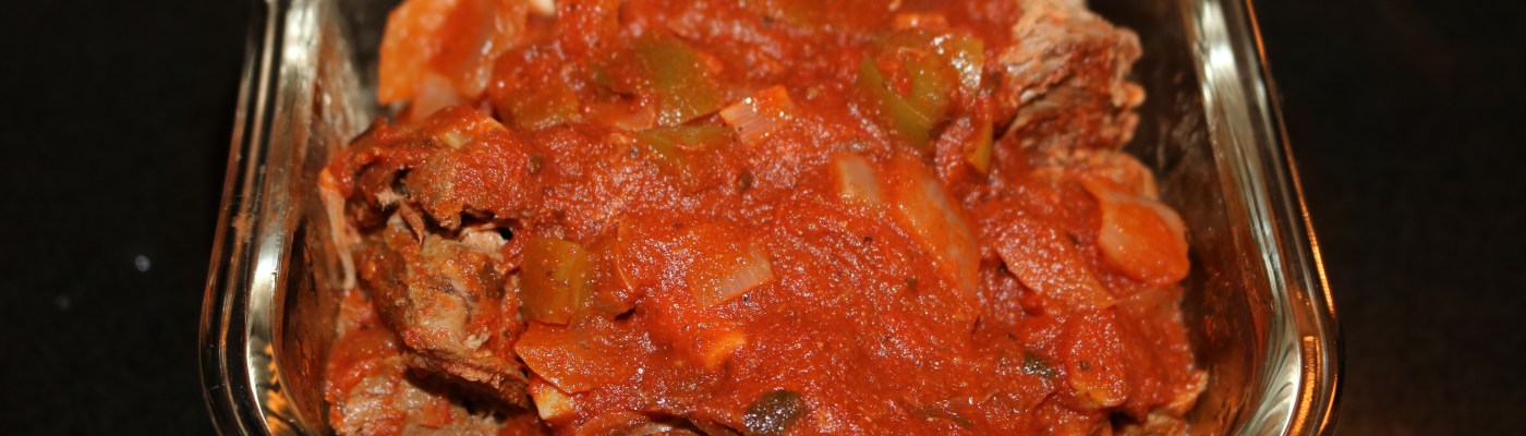 Sizzle some diced garlic in about a tablespoon of oil, then sear your beef roast on both sides for about five minutes a side. Next, drop it into your slow cooker and add 2 cans of tomato sauce, 1 medium diced green pepper, 1 medium diced onion, 1 small can chopped green chiles, 2 tablespoons of tomato paste, 2 teaspoons dried oregano, 2 teaspoons salt, 2 teaspoons ground cumin, 1 tablespoon white vinegar and 1/2 teaspoon red pepper flakes. Cook on low for eight hours.