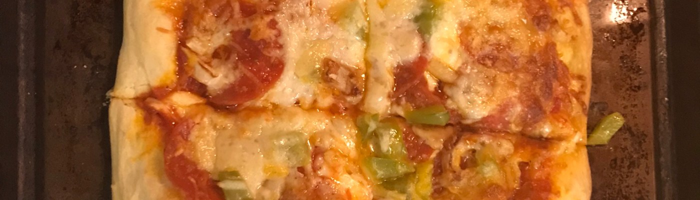 Place ingredients into the bread machine in the order they’re listed above. Run them on the dough cycle. Remove dough and store in a bowl or plastic bag drizzled with olive oil. Stretch the dough out thin onto a baking sheet and top with sauce, cheese and your favorite toppings!