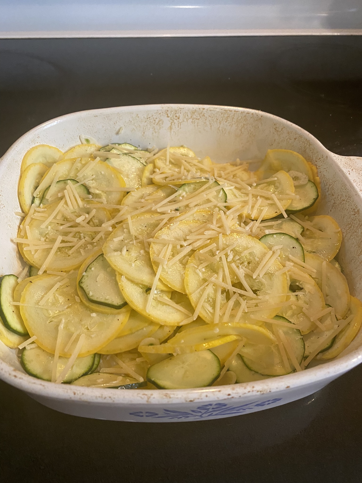 I also prepared a favorite side dish in the spring/summer: Garlic Parmesan Squash and Zucchini. This is so easy to make. Just preheat the oven to 425 degrees, mandolin slice one yellow squash and one zucchini into a baking dish, drizzle with olive oil and sprinkle with salt and pepper, then toss with three cloves diced garlic and 1/4 cup shredded Parmesan cheese. Cover with aluminum foil and bake for 20 minutes, then remove the foil and bake an additional five minutes to let the cheese crisp up. This was delicious alongside the chicken!