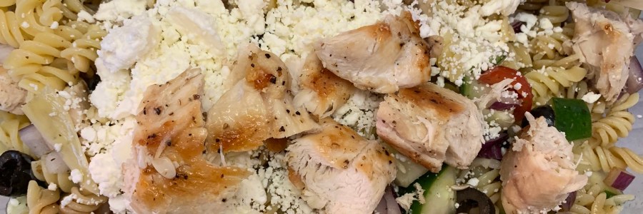 This was so quick and easy I had to share! Cook a box of fusilli or other small pasta (the pasta I used was gluten-free). While that was boiling, I chopped a cucumber, half of a red onion, artichoke hearts, tomatoes and some cooked chicken and tossed them into a big bowl. I added a… Read More Greek Chicken Pasta Salad